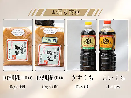 化学調味料不使用。10割糀(中甘口)と12割糀(甘口)の1kg詰が各1個入っています。