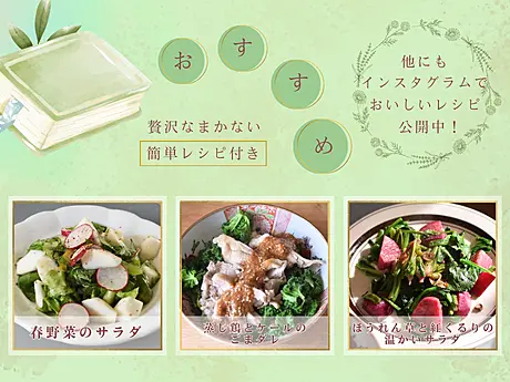 <旨み>の強い野菜は、料理が得意でなくても塩だけで美味しいのですが、農場おすすめのぷらすレシピ・まかないレシピも付いています。