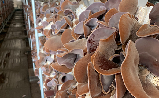 菌床きくらげの旬は6月上旬~10月上旬で、春にハウスの中に菌床を並べ、切り込みを入れて適度な温度・湿度の中で水分を与えていくと、きくらげの芽が出てきます。耳たぶくらいの大きさになったら収穫の目安です。