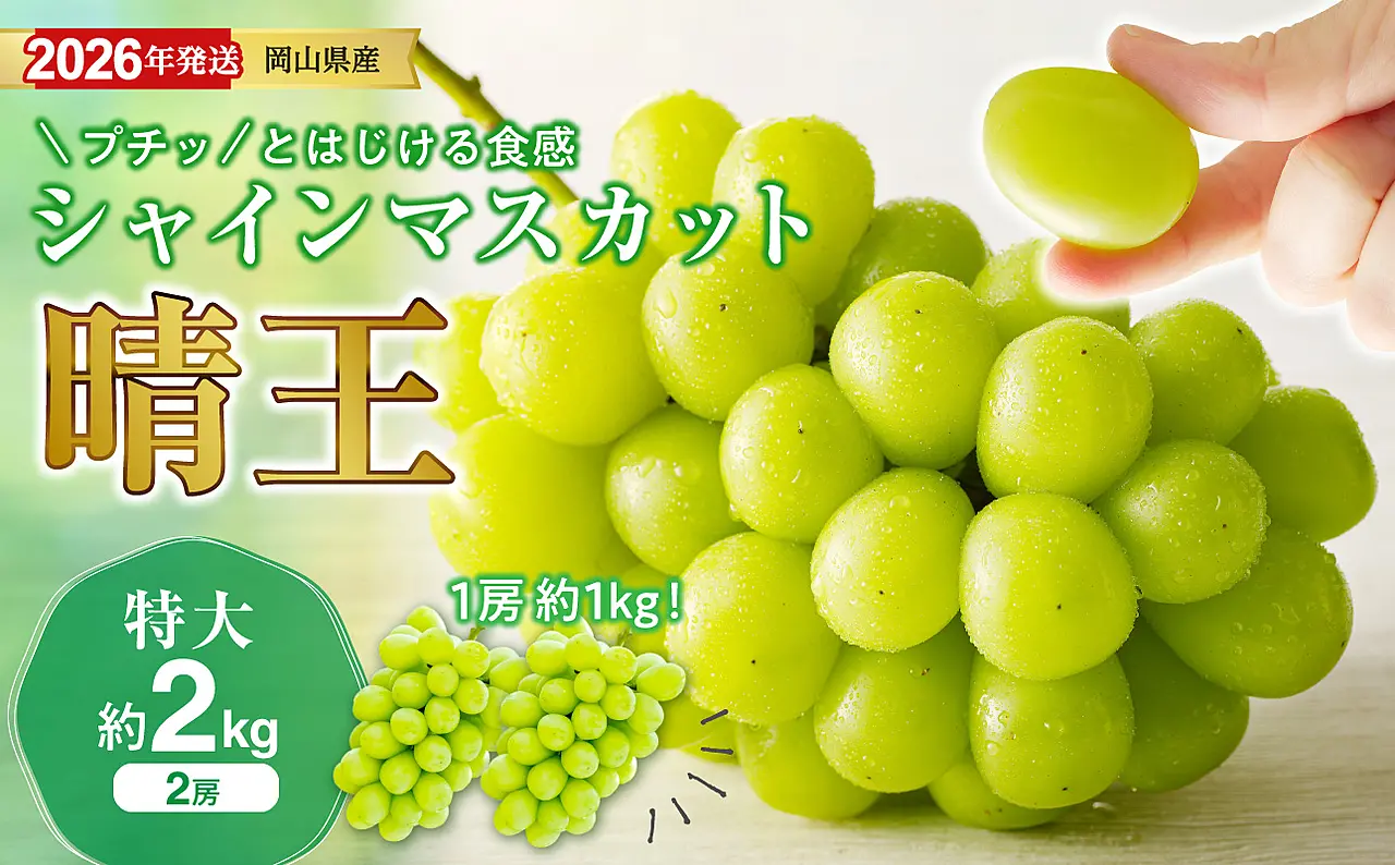 【2026年発送分 先行受付】岡山県産シャインマスカット 「晴王」秀品(特大サイズ2房・約2kg)(令和8年8月中旬以降発送)