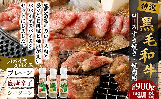 鹿児島黒牛 特選 すき焼き&焼肉 (合計 約900g) 3種のパパイヤスパイス付き