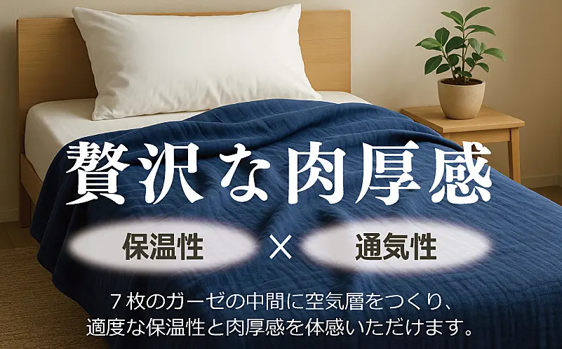 単色後染めならではの味わい深い色彩で、7枚のガーゼの中間に空気層をつくり適度な保温性と肉厚感を体感いただけます。暑い日も適度な通気性で、熱がこもらず爽快です。