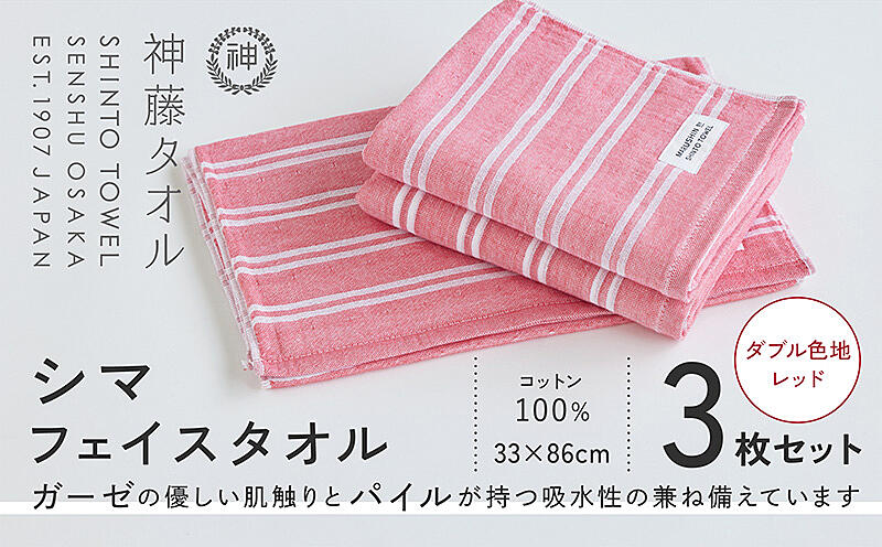 010B1789 神藤タオル「シマ・フェイスタオル」(ダブル色地/レッド)3枚セット