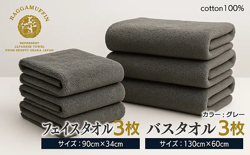 099H2477 高級泉州タオル ラガマフィン バスタオル フェイスタオル グレー 合計6枚(3枚×2種)