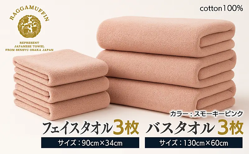 099H2481 高級泉州タオル ラガマフィン バスタオル フェイスタオル スモークピンク 合計6枚(3枚×2種)