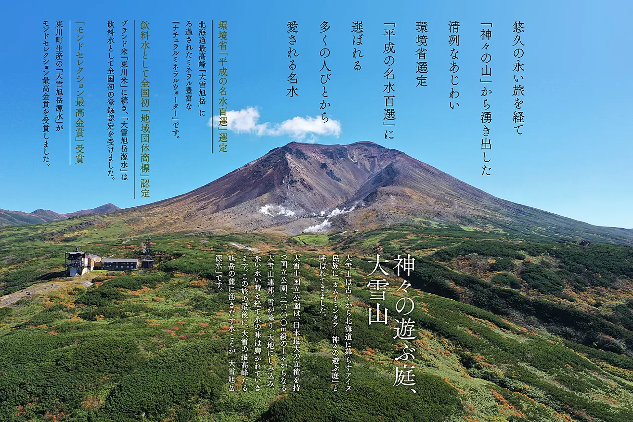 北の最高峰大雪山旭岳の雪解け水が、 このまちに天然水として恵みをもたらします。