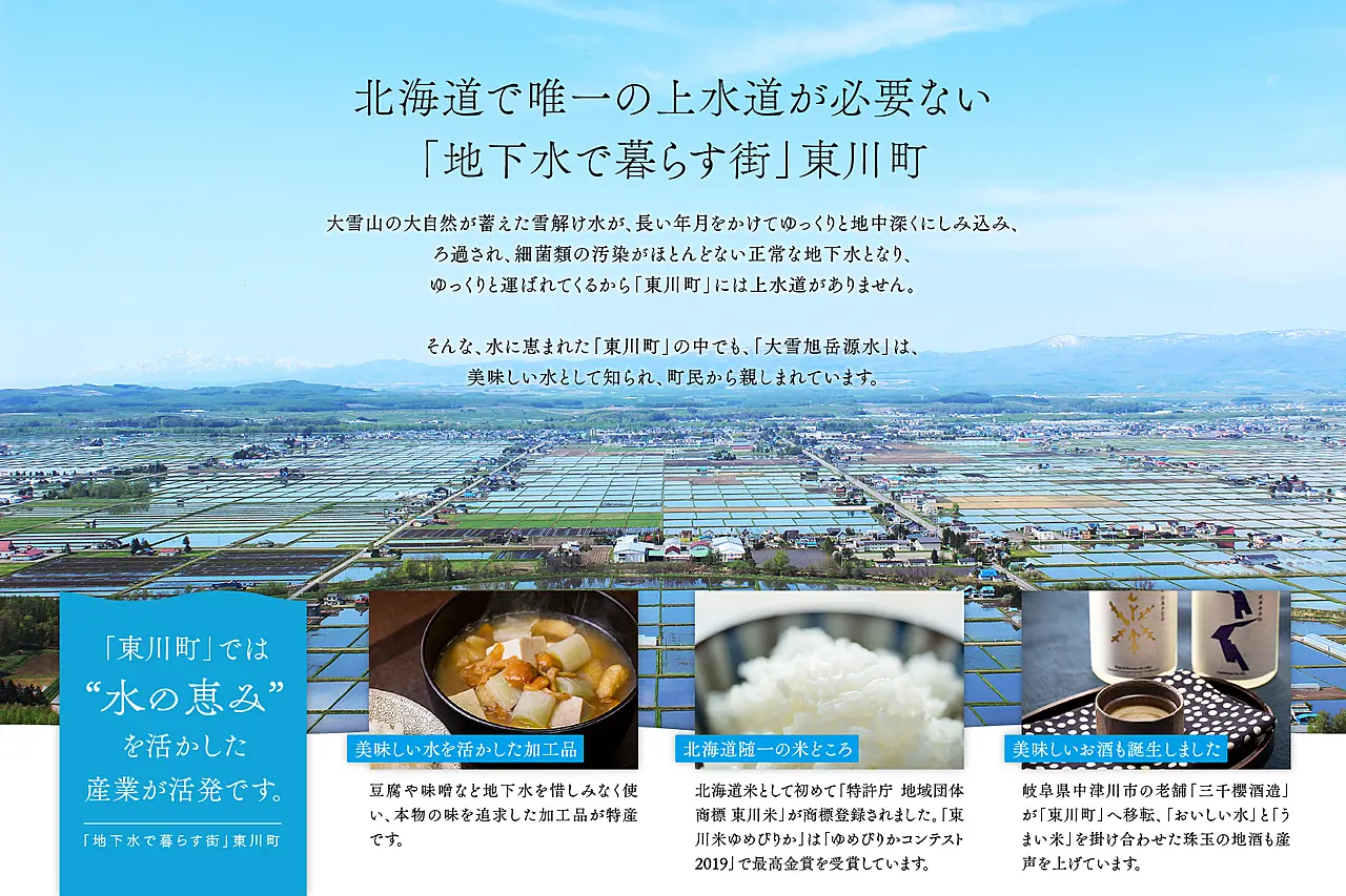 北の最高峰大雪山旭岳の雪解け水が、 このまちに天然水として恵みをもたらします。