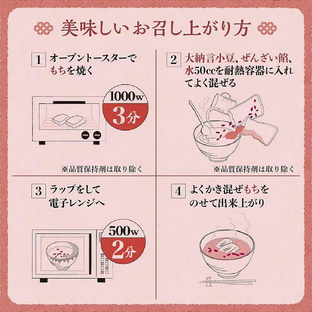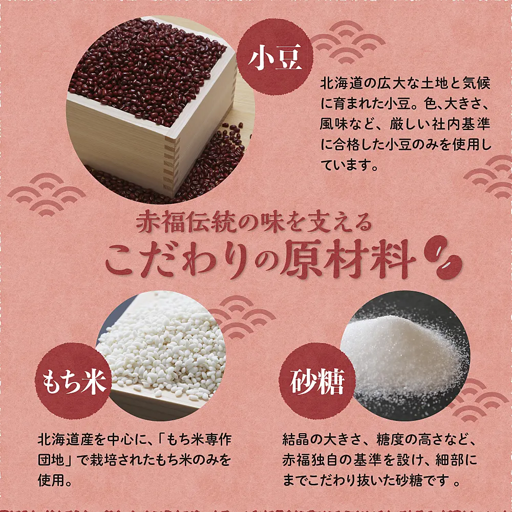 - ぜんざい汁: 砂糖(国内製造)、小豆(北海道産)、澱粉加工品、食塩/グリシン