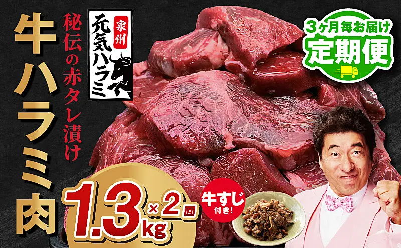 099Z439 【定期便】牛ハラミ肉 総量1.3kg(ハラミ300g×4P+牛すじ100g)秘伝の赤タレ漬け【3月&6月発送】