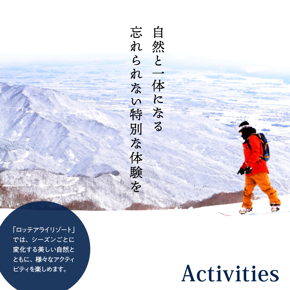 ロッテアライリゾートは、新潟県妙高市の大毛無山を背景にしたスキー場と、通年を通して体験が出来るアクティビティ施設、ホテル施設においての複合リゾートです。