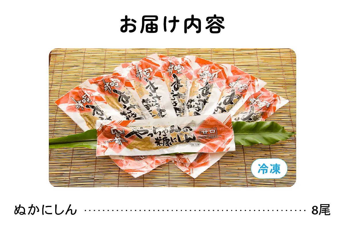 焼き物にするには、糠を綺麗に洗い落とし、食べやすい大きさに切り、焼いてお召し上がりください。また三平汁としても食べられる製品です。糠を洗い落とし、お好みのお野菜と煮込み、味噌などで味付けしお召し上がりください。