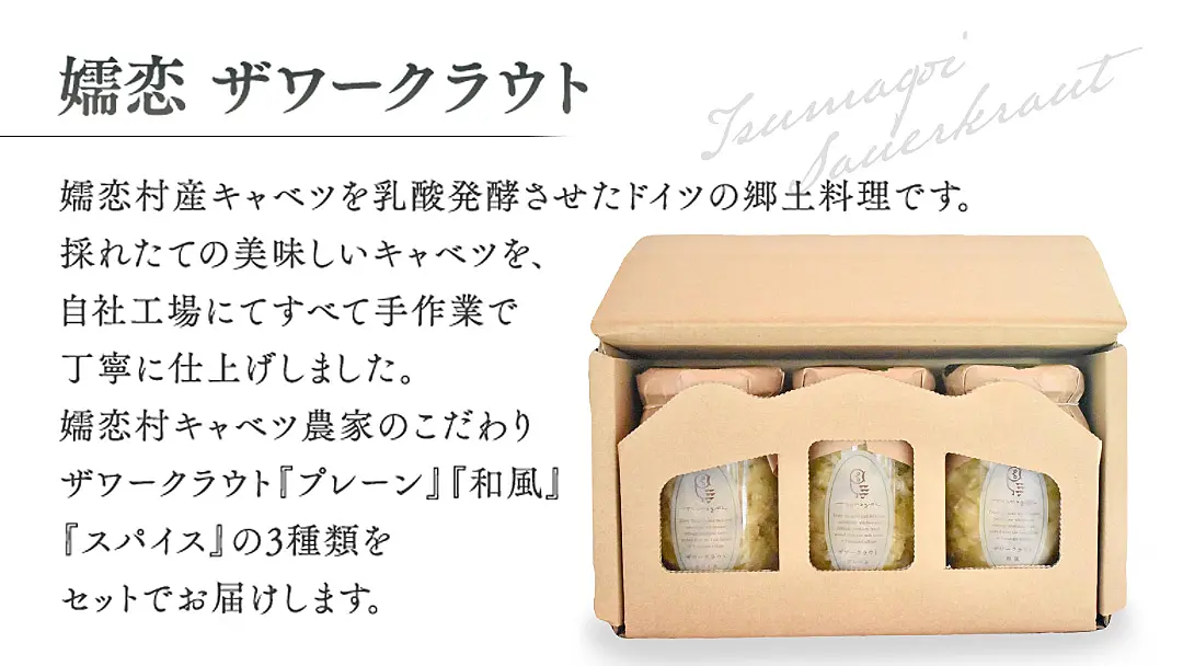 嬬恋村キャベツ農家のこだわりザワークラウト『プレーン』『和風』『スパイス』の3種類をセットでお届けします。
