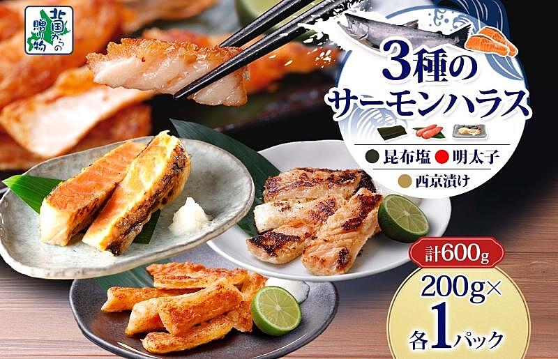 005A743 サーモンハラス 3種 食べ比べ 200g 各1パック 昆布塩 明太子 西京漬け