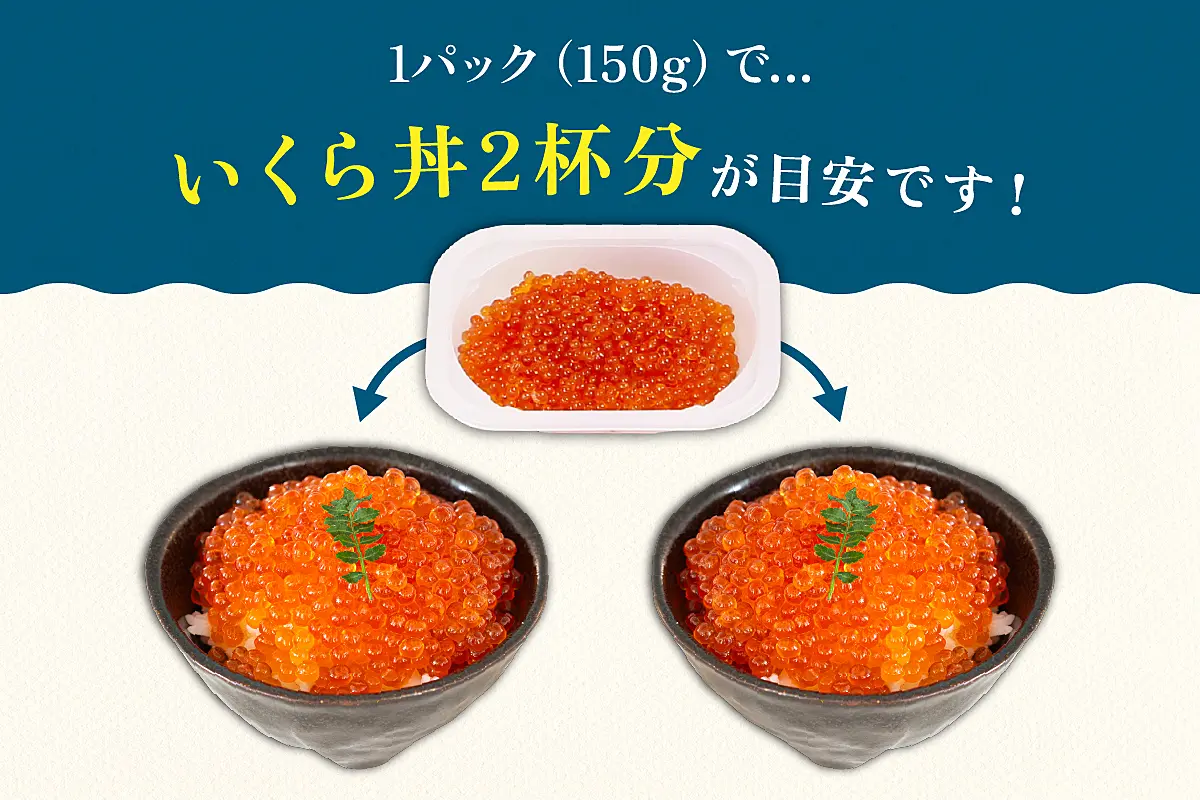 イクラ150g(1パック)に対し、イクラ丼2杯分、イクラの軍艦巻18~20巻が目安です!