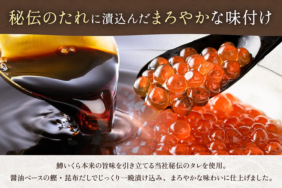 新鮮なロシア産の鱒イクラを使用し、鰹・昆布タレに漬込み素材の味を活かした、まろやかな味に仕上げました。