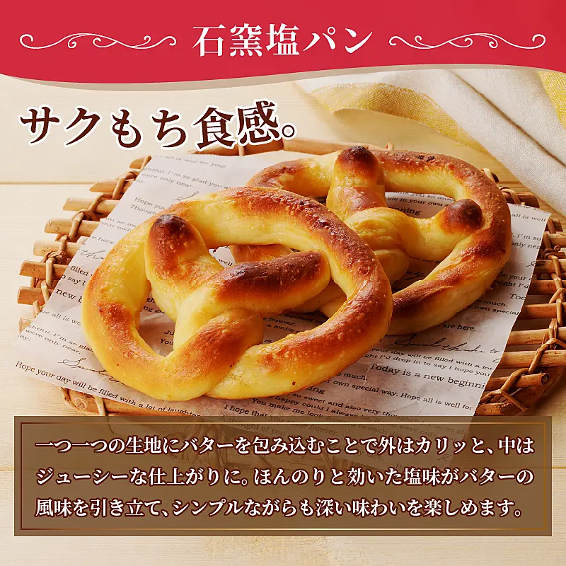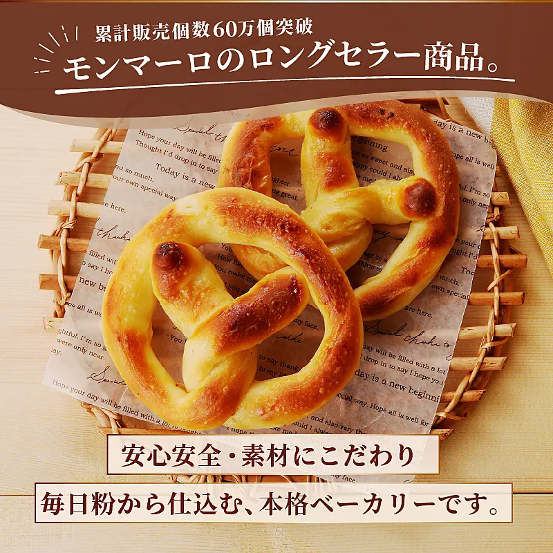 「モンマーロのオリジナル塩パン」地元で愛され、累計販売個数60万個を突破した人気No.1商品、モンマーロの塩パン。プレッツェルのような形が特徴で、他にはないオリジナル製法で丁寧に作っています。一つ一つの生地にバターを包み込むことで、外はカリッと、中はジューシーな仕上がりに。塩は100%自然の力で生まれる天日塩、フランス産ゲランドの塩を使用。ほんのりと効いた塩味がバターの風味を引き立て、シンプルながらも深い味わいを楽しんでいただけます。モンマーロのロングセラー、人気No.1商品をぜひお試しください。