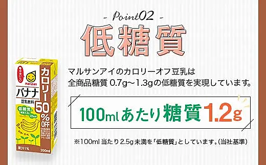 また、飲み口もすっきりと仕上げ、毎日飲んでも飲み飽きない、バナナ風味のおいしい低糖質豆乳飲料です。