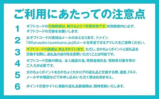 - 入金確認後7日以内に、さのちょくギフト専用サイトURLとギフトコードをご登録のメールアドレスまでお送りします。