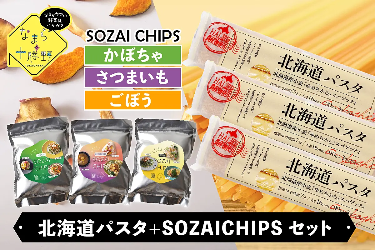 北海道十勝芽室町 北海道パスタとSOZAI CHIPS【さつまいも・かぼちゃ・ごぼう】3種セット me026-042c