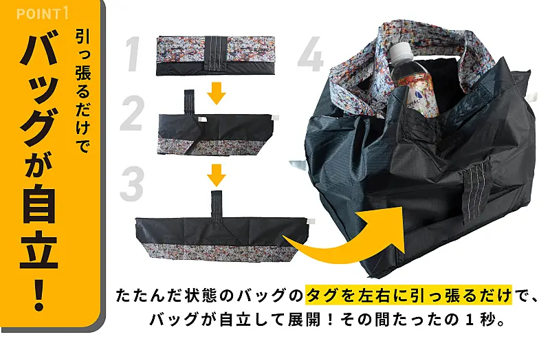 (1)たたんだ状態のバッグのタグを左右に引っ張るだけで、バッグが自立して展開!その時間たったの1秒!自立するORIBAなら両手が使えて袋詰めが楽々!