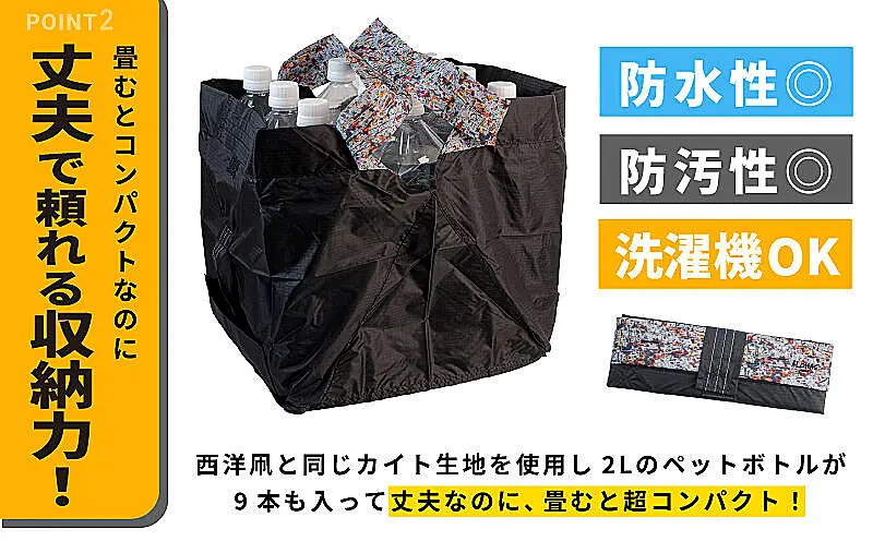 (3)2Lのペットボトルが9本も入るのに、バッグ自体は45g、畳むと7.5×24×1cmと超軽量で極薄コンパクト!