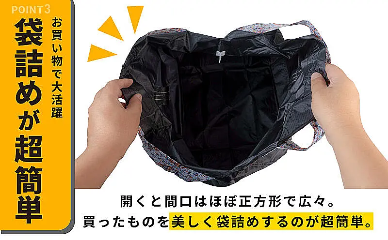 (2)開くと間口はほぼ正方形で広々。買ったものを美しく簡単に袋詰めすることができます!