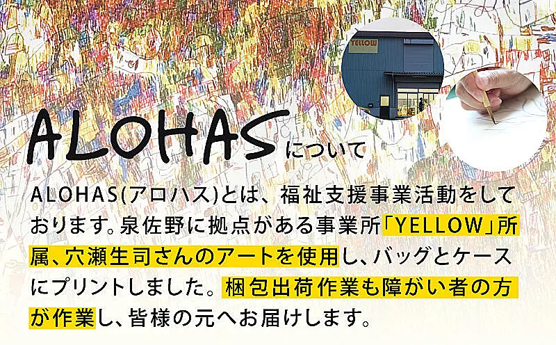 泉佐野市に拠点がある事業所「YELLOW」所属、穴瀬生司さんのアートを使用し、バッグとケースにデザインをプリントしています。また梱包出荷作業を障がい者の方が作業し、皆様の元へお届けします。
