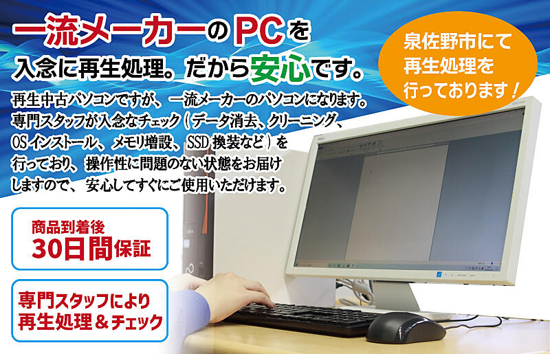 弊社の泉佐野営業所に入庫してからデータ消去、クリーニング、OSインストール、メモリ増設、SSD換装などを行い、再生しています。
