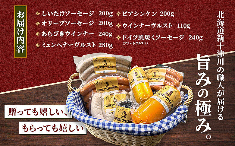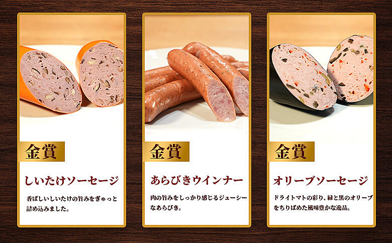 - しいたけソーセージ200g、オリーブソーセージ200g、あらびきウインナー240g、ミュンヘナーヴルスト280g、ビアシンケン200g、ウインナーヴルスト110g、ドイツ風焼くソーセージ240g