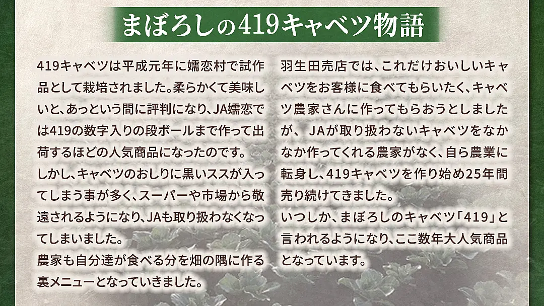 いつしか、まぼろしのキャベツ「419」と言われるようになり、ここ数年大人気商品となっています。