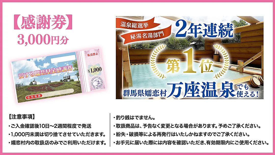 嬬恋村内の取扱店でご利用可能な感謝券を3,000円分(3枚)お贈りします。