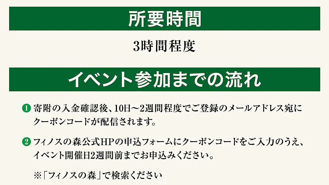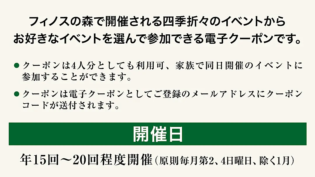 2.フィノスの森公式HPの申込フォームにクーポンコードをご入力のうえ、イベント開催日2週間前までお申込みください。