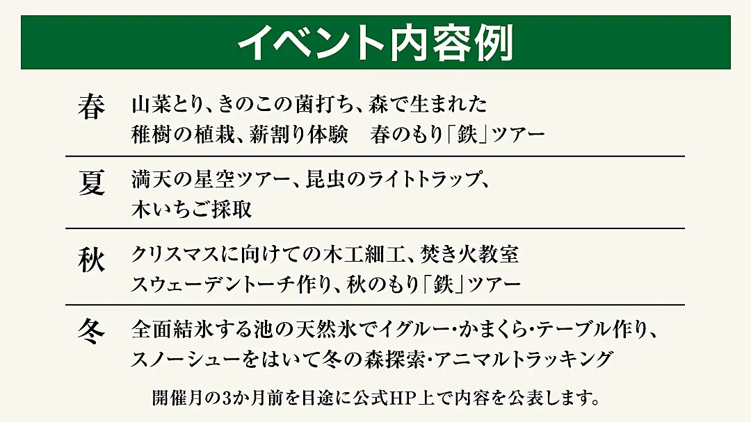 四季それぞれ森ならではの自然体験をとおして、環境保全についても学べる、大人も子供も楽しめるイベントを企画しております。