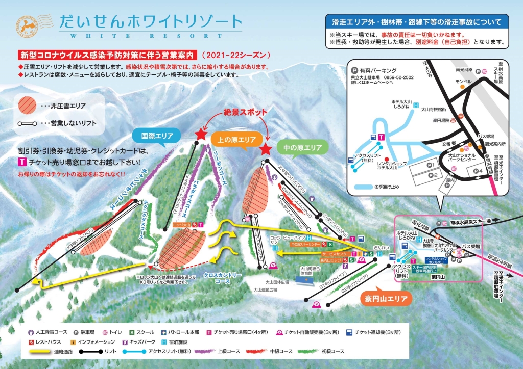 雄大な大山の斜面を利用したスケールの大きなゲレンデは、すべり心地満点。豪円山、中の原、上の原、国際の4エリアがあり、すべてのゲレンデが各コースに隣接しているので、多彩なコース、ロケーションでウインターリゾートを満喫することが可能です。