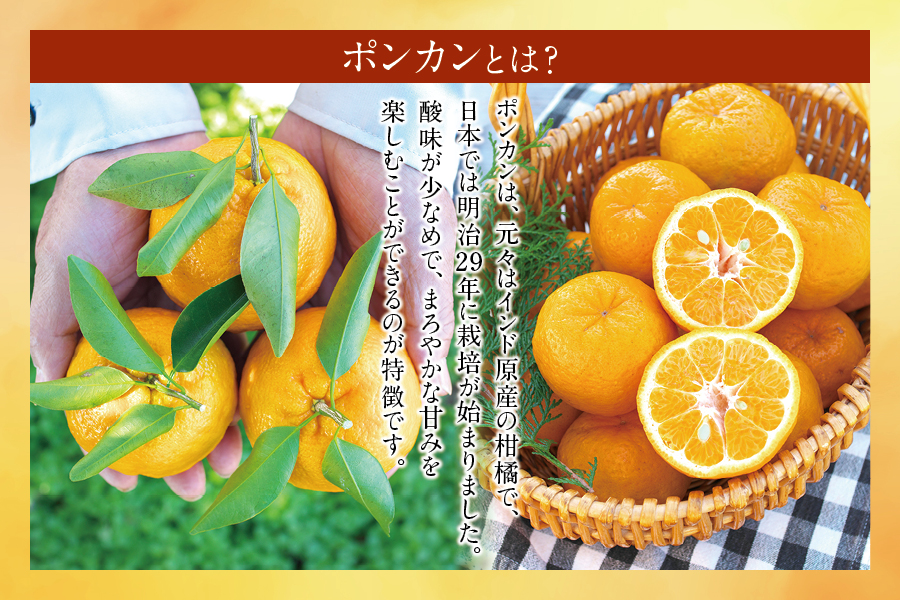 柑橘類といえば一般的な温州みかんを想像される方が多いかと思いますが、ポンカンは温州みかんに比べて甘さが強く濃厚な味わいが特徴。