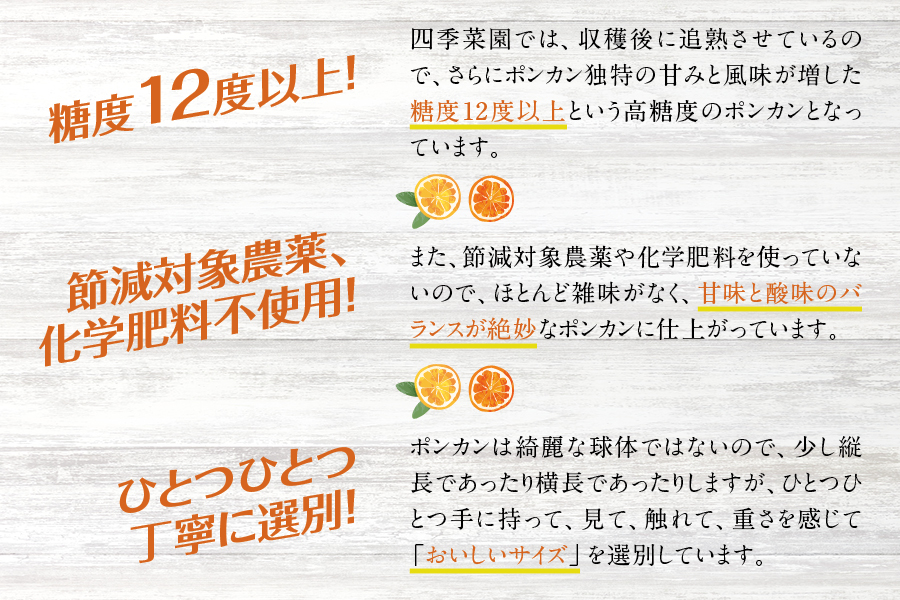 栽培環境と、徹底した栽培管理により、「安心・安全」「味がよくコクがある」「深みのある後味の良い」ポンカンに仕上がっています。