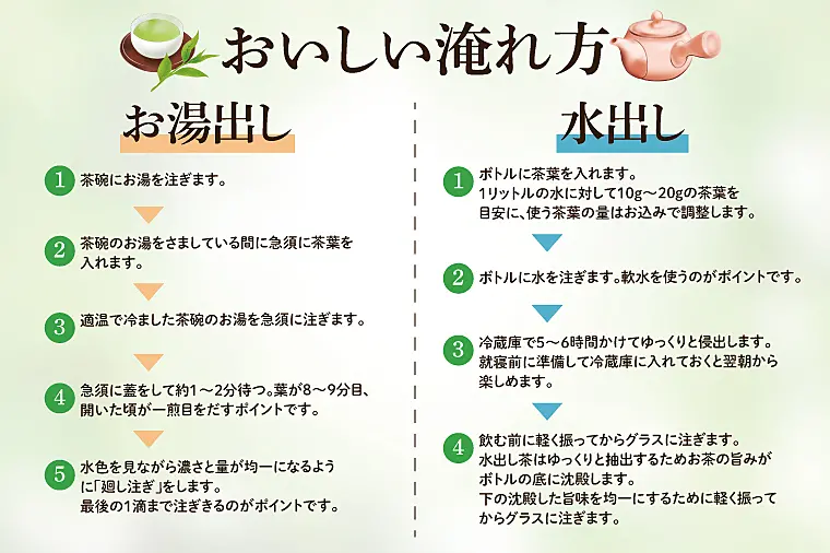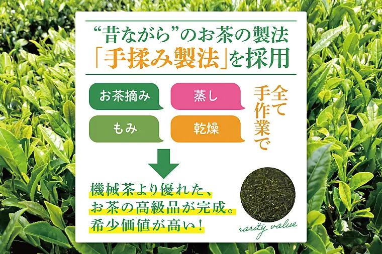 その中でも、昔ながらのお茶の製法として、手もみ茶があります。お茶摘みから、蒸し、もみ、乾燥まで全て手作業で行い、焙炉(ほいろ)という台の上でもみは3時間ほど行われ、仕上がったお茶のその形は針のようによれ、光沢は緑黒く、なぜか磯の味がします。どれを見ても機械茶より優れ、お茶の高級品として扱われています。