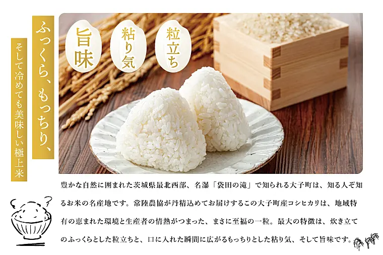 常陸農協が丹精込めてお届けするこの大子町産コシヒカリは、地域特有の恵まれた環境と生産者の情熱がつまった、まさに至福の一粒。