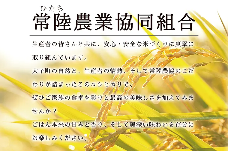 常陸農協は、生産者の皆さんと共に、安心・安全な米づくりに真撃に取り組んでいます。大子町の自然と、生産者の情熱、そして常陸農協のこだわりが詰まったこのコシヒカリで、ぜひご家族の食卓を彩りと最高の美味しさを加えてみませんか?