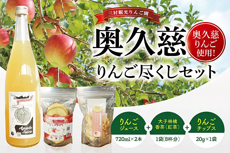 三村観光りんご園が誇る奥久慈りんご尽くしセット(ジュース720ml×2本・林檎香茶1袋・チップス1袋) (BX007)