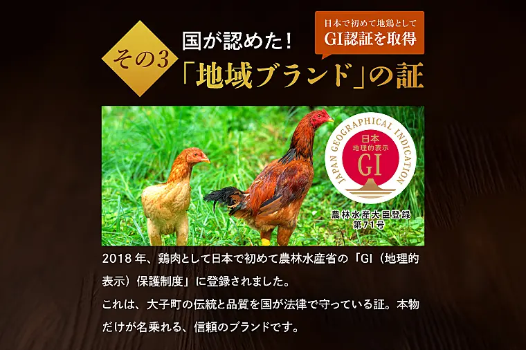 2018年、鶏肉として日本で初めて農林水産省の「GI(地理的表示)保護制度」に登録されました。これは、大子町の伝統と品質を国が法律で守っている証。本物だけが名乗れる、信頼のブランドです。