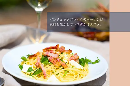 また、パンチェッタのブロックは野菜やパスタにあえて召し上がっていただくのも、オススメです。