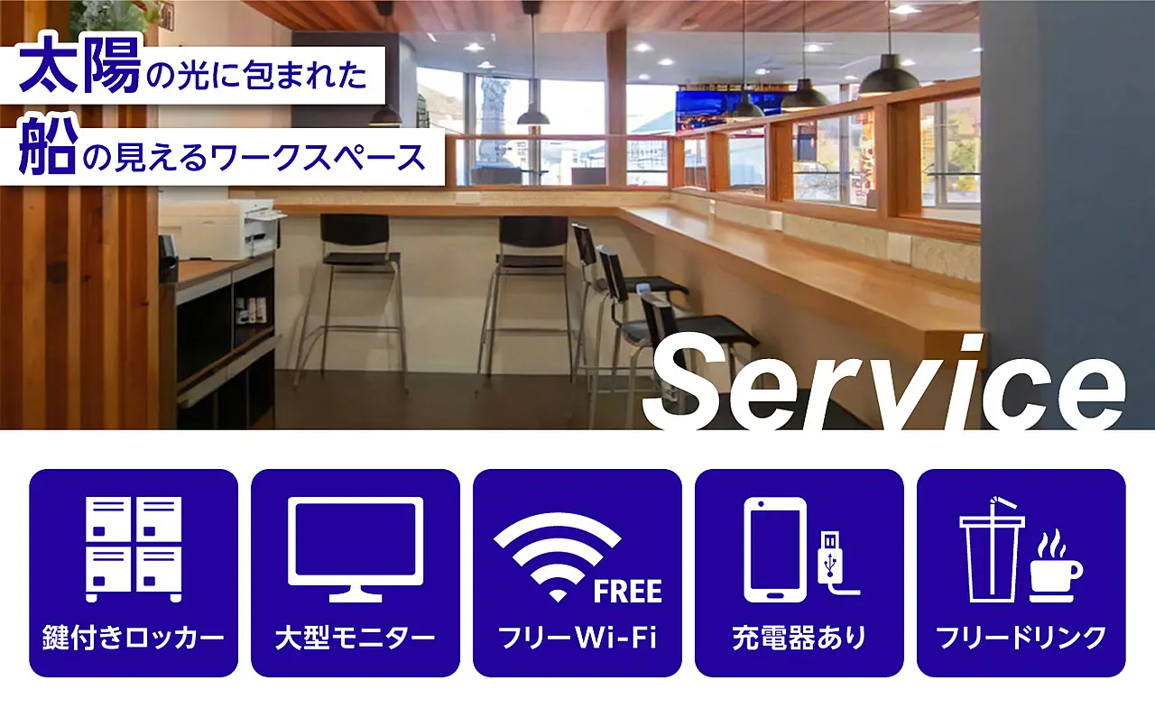 フリードリンク・無料Wi-Fi・充電器あり・大型モニター・鍵付きロッカー(出し入れ自由)も完備しておりますので、仕事・勉強・観光など備前にお越しの際にご利用ください。
