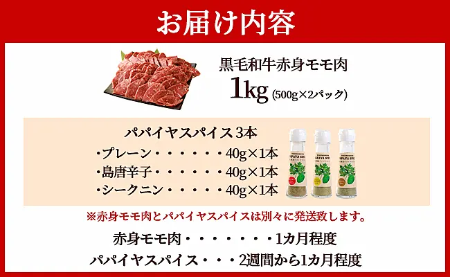 黒毛和牛 赤身モモ肉 焼肉用(1kg)& パパイヤスパイス3種セット 牛肉 もも肉 バーベキュー