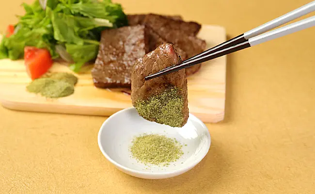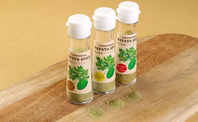 この葉を乾燥させて粉末にしコショウと徳之島産の塩をブレンドしたスパイスは、お肉を柔らかくするほか、様々なお料理と相性抜群です。
