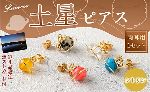 鹿児島県 天城町 土星 ピアス シトリン 1個 天然石ビーズ パワーストーン 両耳用 サージカルステンレス 幅2cm