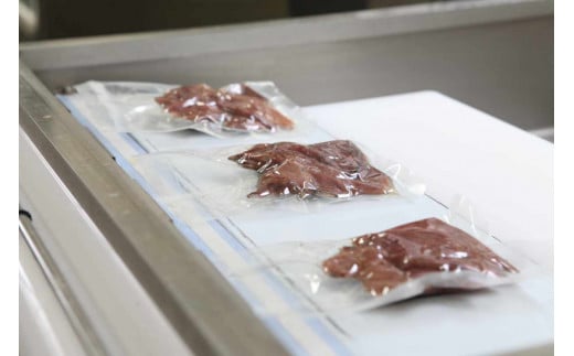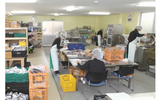 材料を蒸して、余分な脂を落とし、真空パックし高温殺菌しています。
