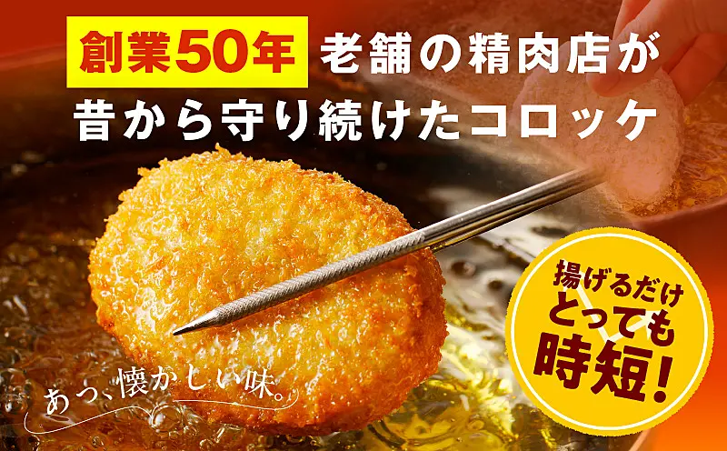 創業は50年前、市場で販売を始めた精肉店の昔懐かしい手作りコロッケです。最高の食材を使い、製法にこだわり、約50年間、変わらない味を守り続けています。