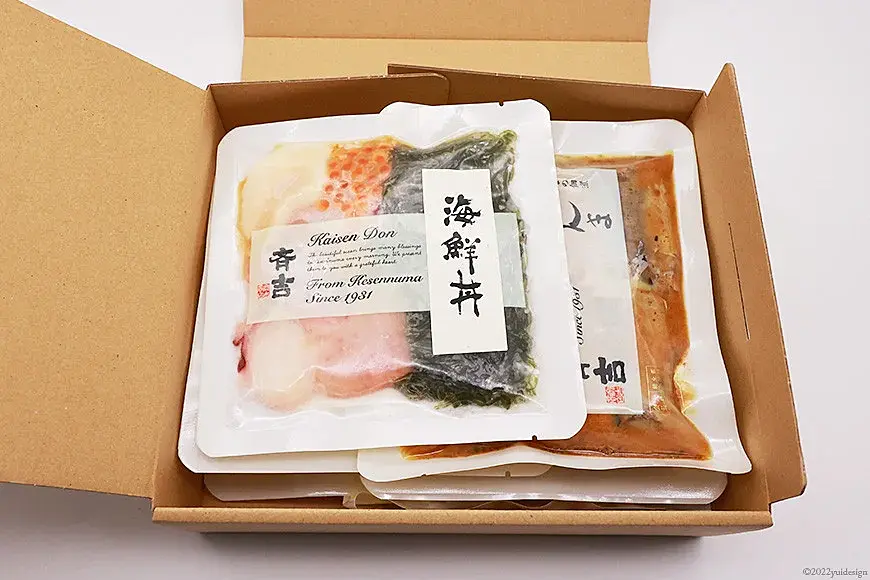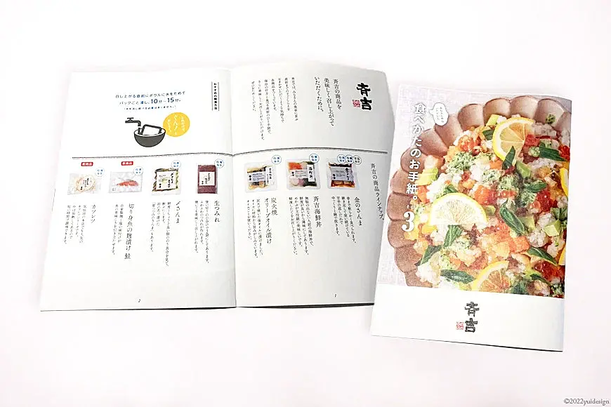 ・斉吉海鮮丼:めかぶ(三陸産)、びんちょうまぐろ(国産)、たこ(北海道産)、いくら醤油漬け(国産いくら使用)、帆 立(北海道産)、白醤油、醤油、清酒、みりん、 (原材料の一部に小麦、いくら、大豆 を含む)