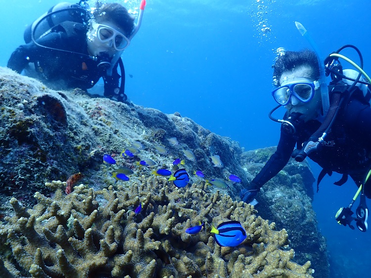 黒潮によって暖められた海中には、南国のような美しいサンゴ礁が広がっており、その光景を見るためにダイビングに訪れる人が大勢います。